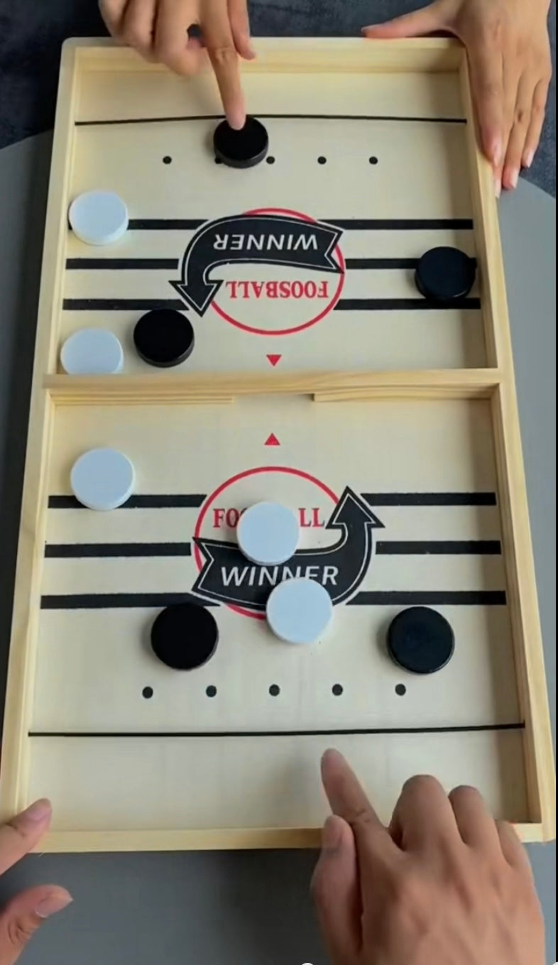 Câștigă jucătorul care reușește primul să trimită toate pucurile în jumătatea adversarului!