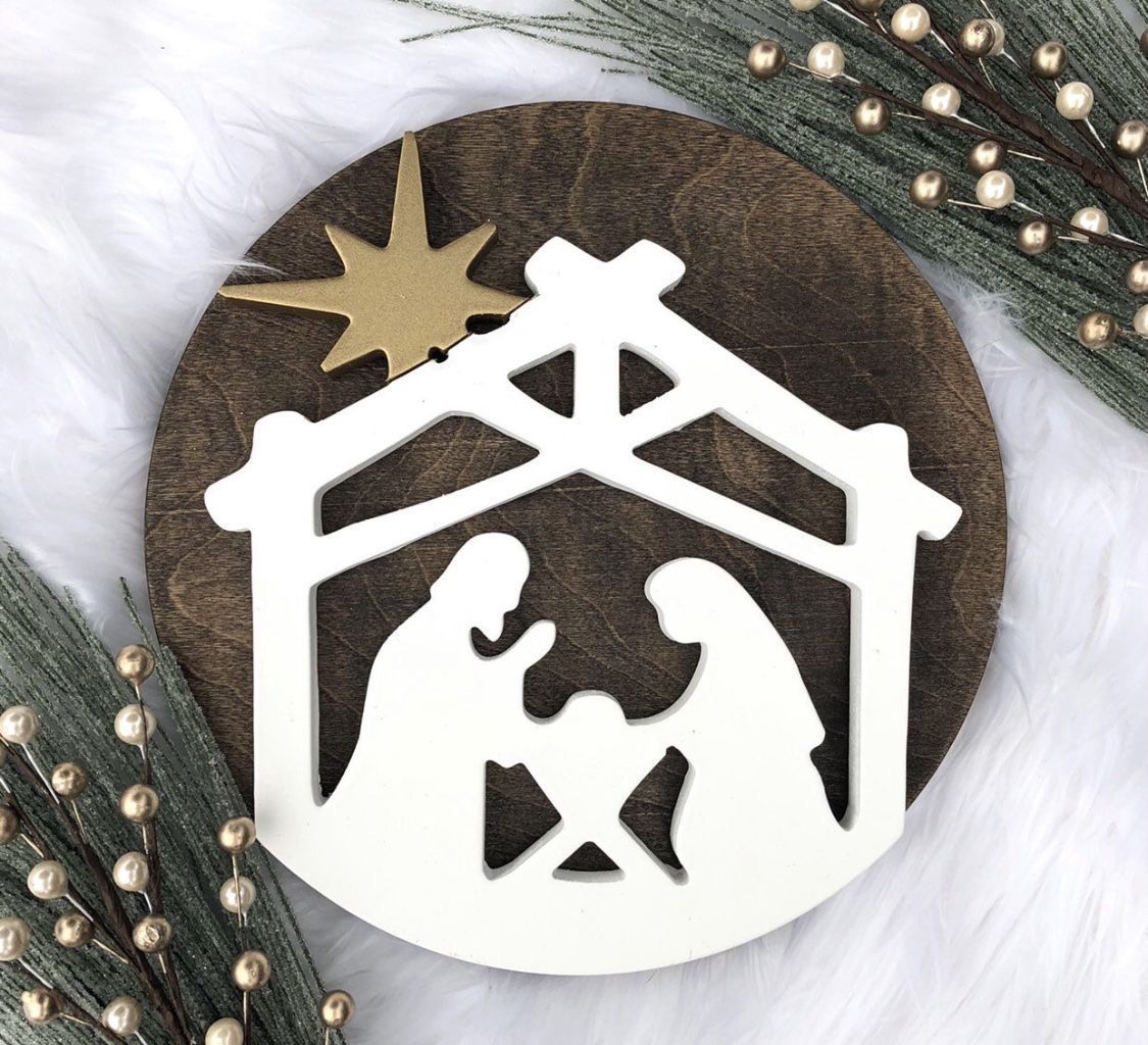 Adaugă un decor festiv impresionant casei tale cu acest tablou mare rotund din lemn. Cu un diametru de 40 cm, tabloul prezintă scena Nașterii Domnului Iisus, gravată cu atenție la detalii și cu elemente lipite pentru un efect tridimensional deosebit.